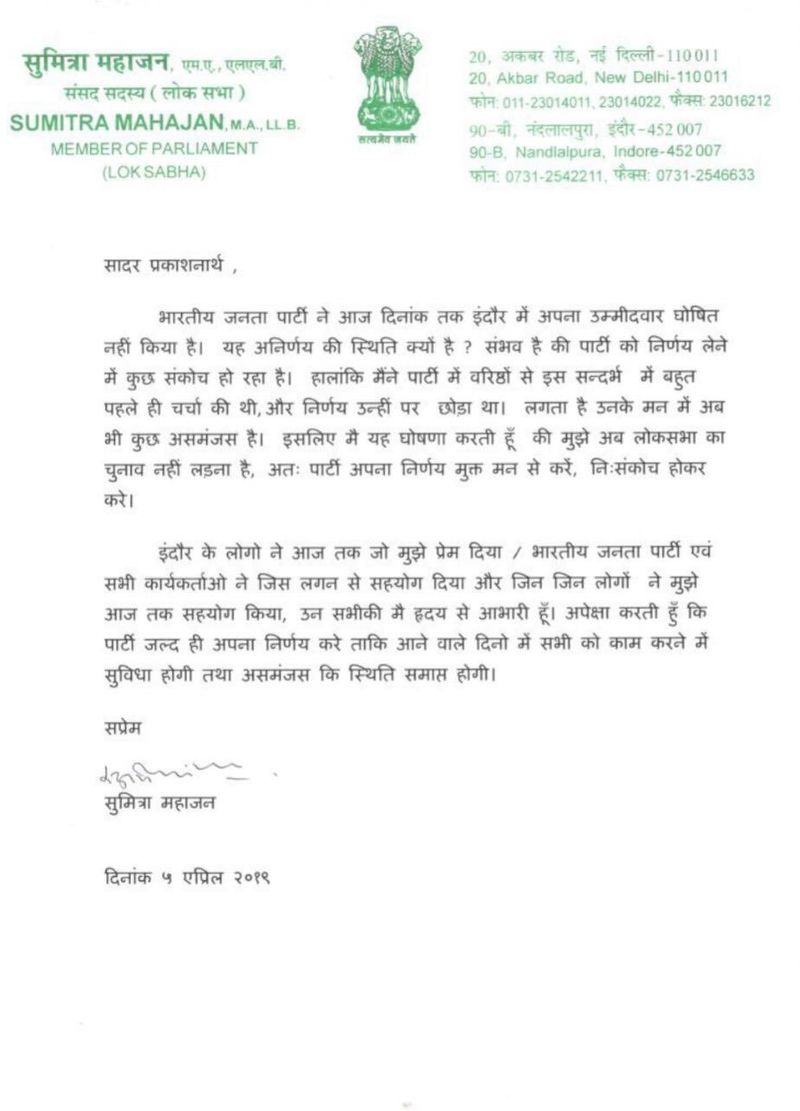 Sumitra Mahajan's call to not contest in the elections from the Indore seat could be an indication that she wants to retire from electoral politics. She made this announcement in a statement released from her official letterhead as Member of Parliament