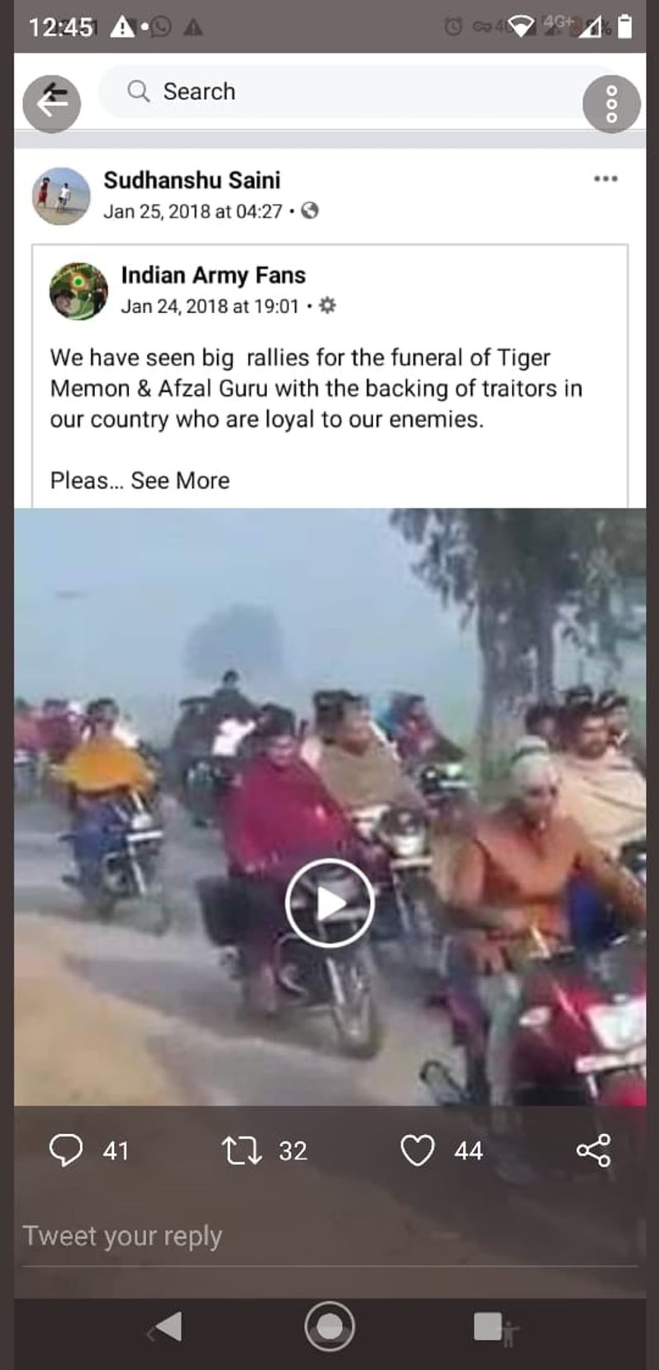 So what had Sudhanshu put? Well, he had said that “big rallies for the funeral of Tiger Memon and Afzal Guru with the backing of traitors in our country…”