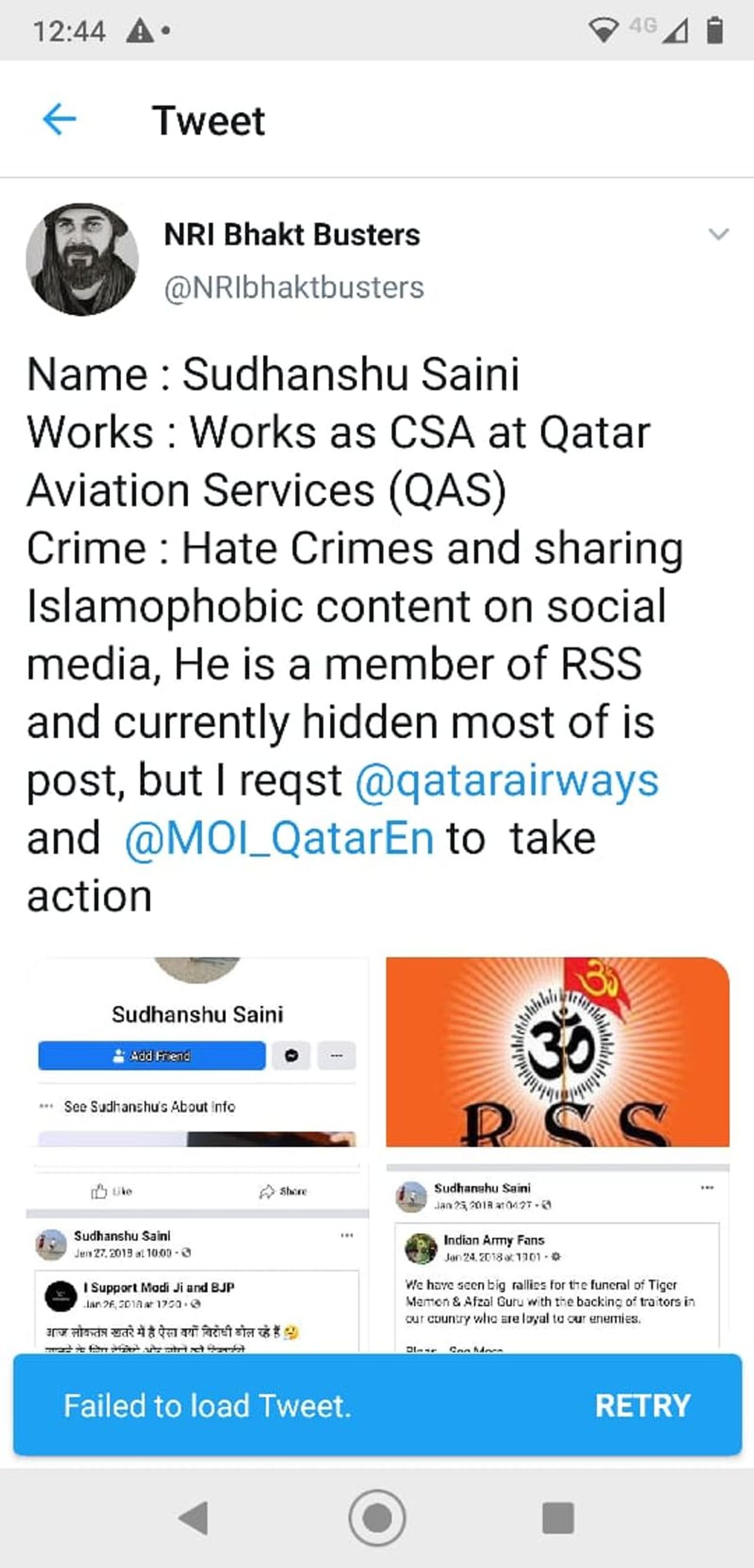 He had put out the information of an NRI by name Sudhanshu and pieces of information relating to his profession. He had even urged Qatar Airways to take action.