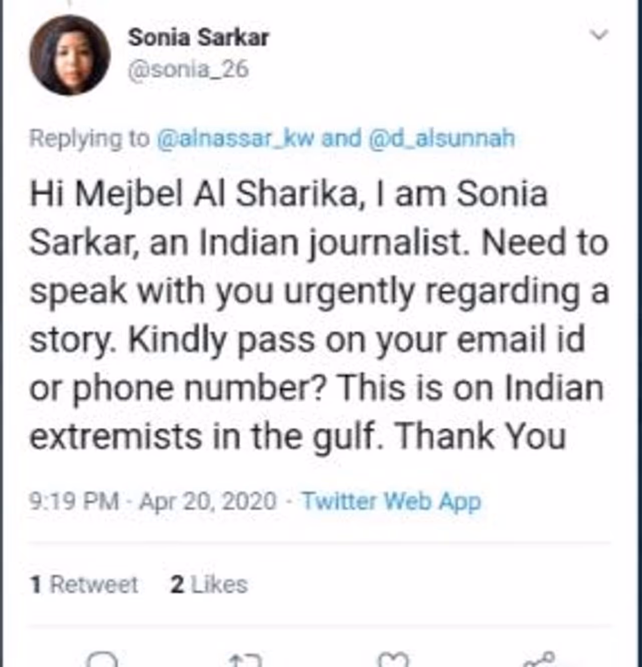 As we looked at her tweet, we also understood that she introduced herself to a person named Mejbel Al Sharika and wanted his contact details to report about Indian extremists in the Gulf.