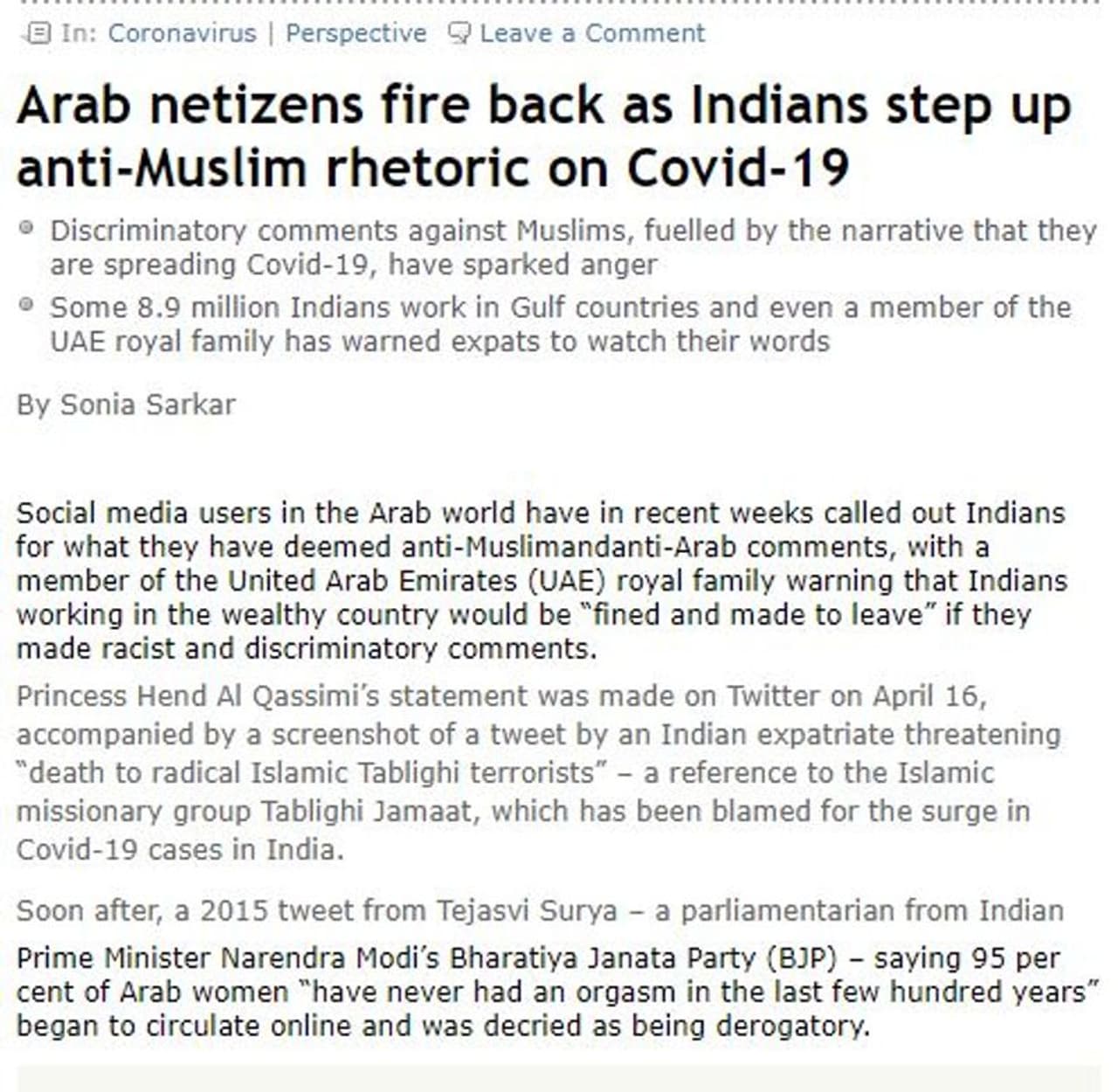 A journalist by name Sonia Sarkar sought contact details of a person in a foreign country with a view to report Indian extremists in the Gulf.
