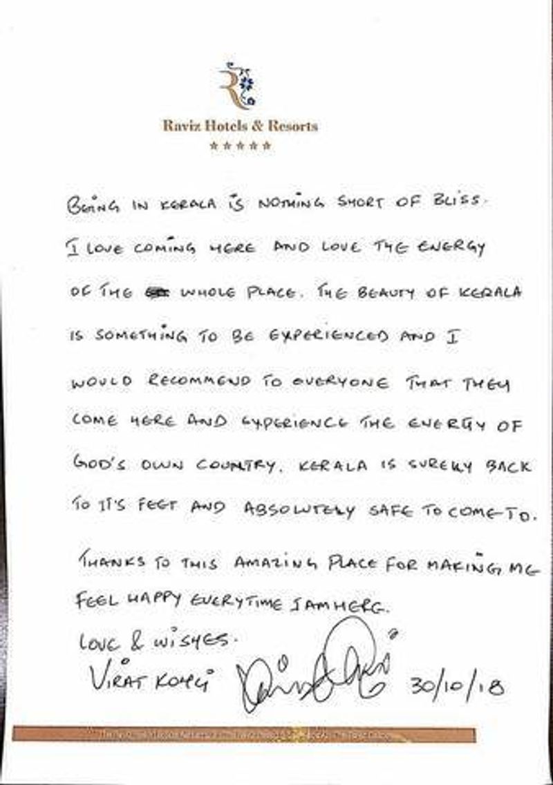 “Kerala’s natural beauty and hospitality are great. I love to come to Kerala. The energy I get from here is very important. This place is very safe. I invite all people here to experience its beauty. My special thanks to Kerala for making me happy,” Kohli wrote in the visitor’s book at Kovalam Raviz Hotels and Resorts.