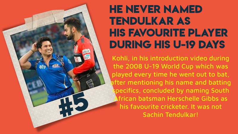 Kohli, in his introduction video during the 2008 U-19 World Cup which was played every time he went out to bat, after mentioning his name and batting specifics, concluded by naming South African batsman Herschelle Gibbs as his favourite cricketer. It was not Sachin Tendulkar!
