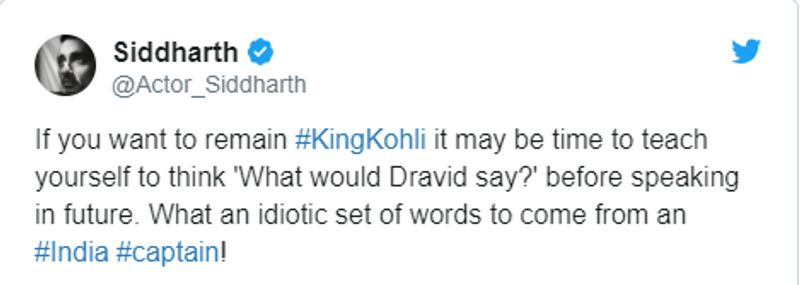 Actor Siddharth, criticised Kohli for his poor choice of words used against the fan. His tweet read, "If you want to remain King Kohli it may be time to teach yourself to think 'What would Dravid say?' before speaking in future. What an idiotic set of words to come from an India captain! (sic)"