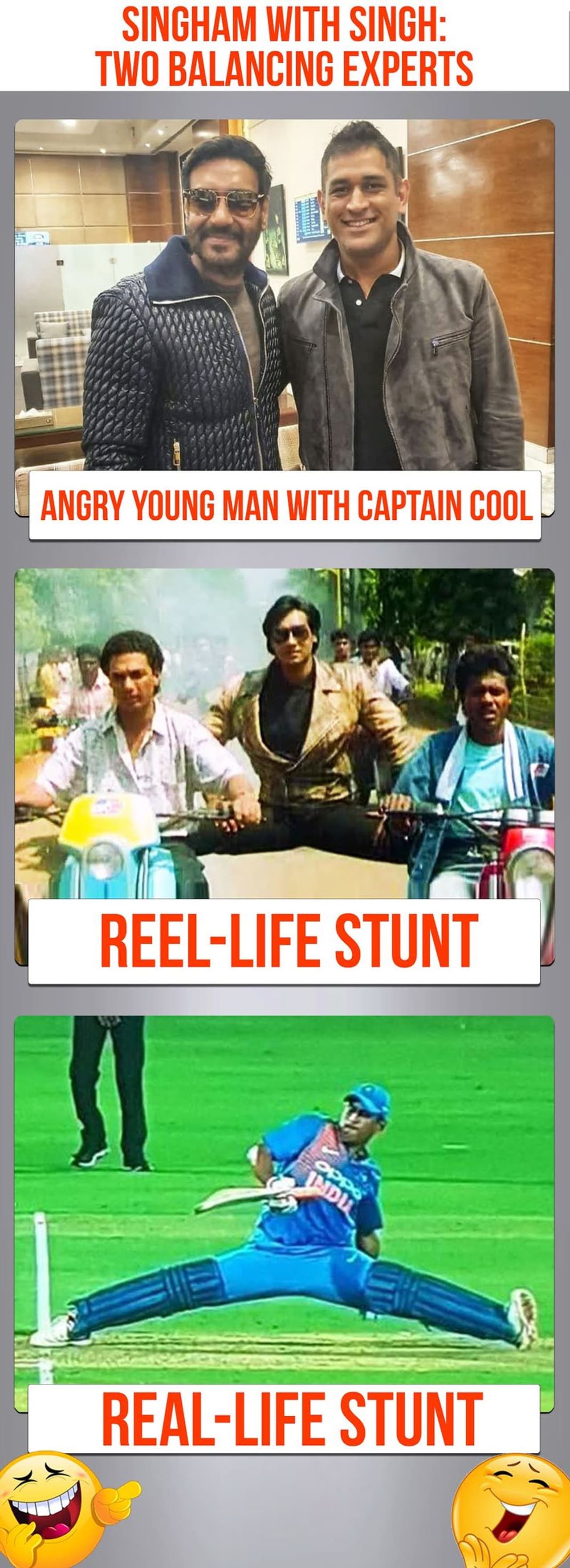 MyNation’s JustForLaughs drew a parallel between the actor and the cricketer, with the pictures of Devgn's famous bike stunt scene from Phool aur Kaante and Dhoni's mind-blowing stretch to save his wicket on field.