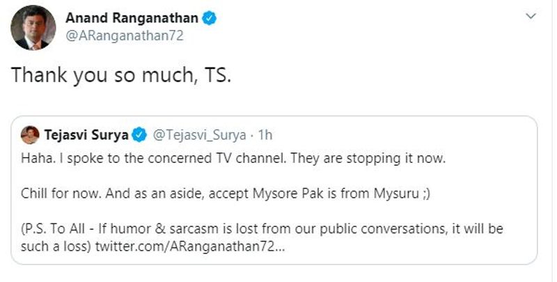 To which, MP Surya replied: Haha. I spoke to the concerned TV channel. They are stopping it now. Chill for now. And as an aside, accept Mysore Pak is from Mysuru ;) (P.S. To All - If humor & sarcasm is lost from our public conversations, it will be such a loss).