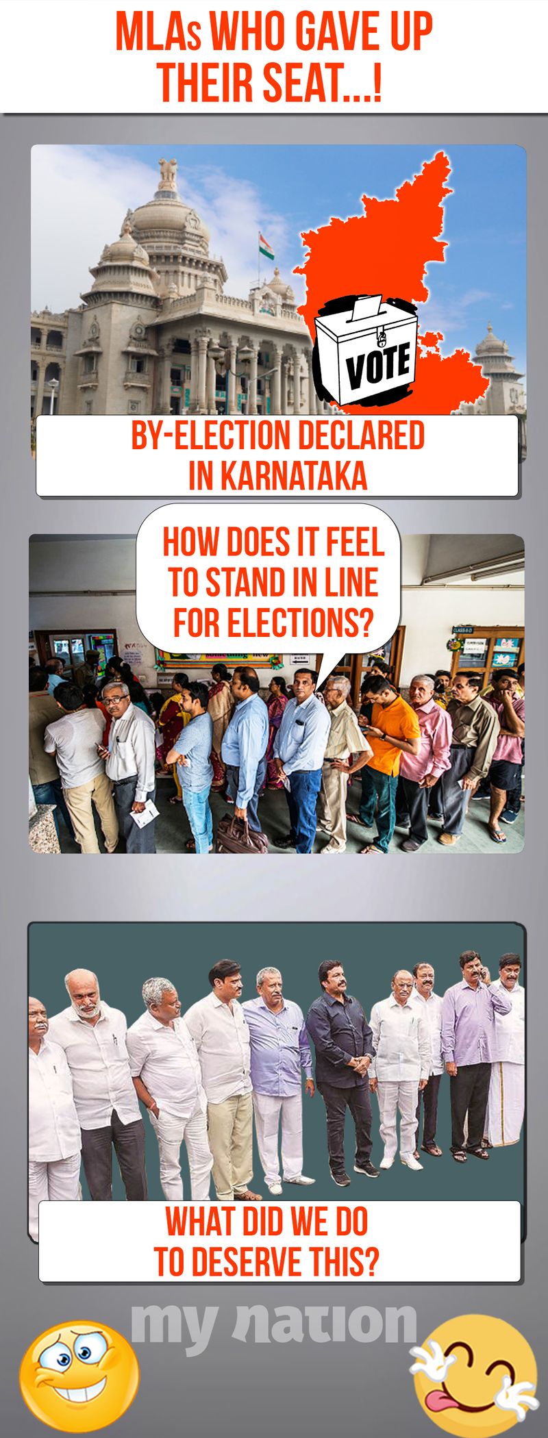 Karnataka MLAs, who gave up their seats and got disqualified, are gearing up to fight the by-elections to regain the seats. Will they be stood up by the public or will the people stand by these former MLAs, only time will tell. Watch Just For Laughs on MyNation.