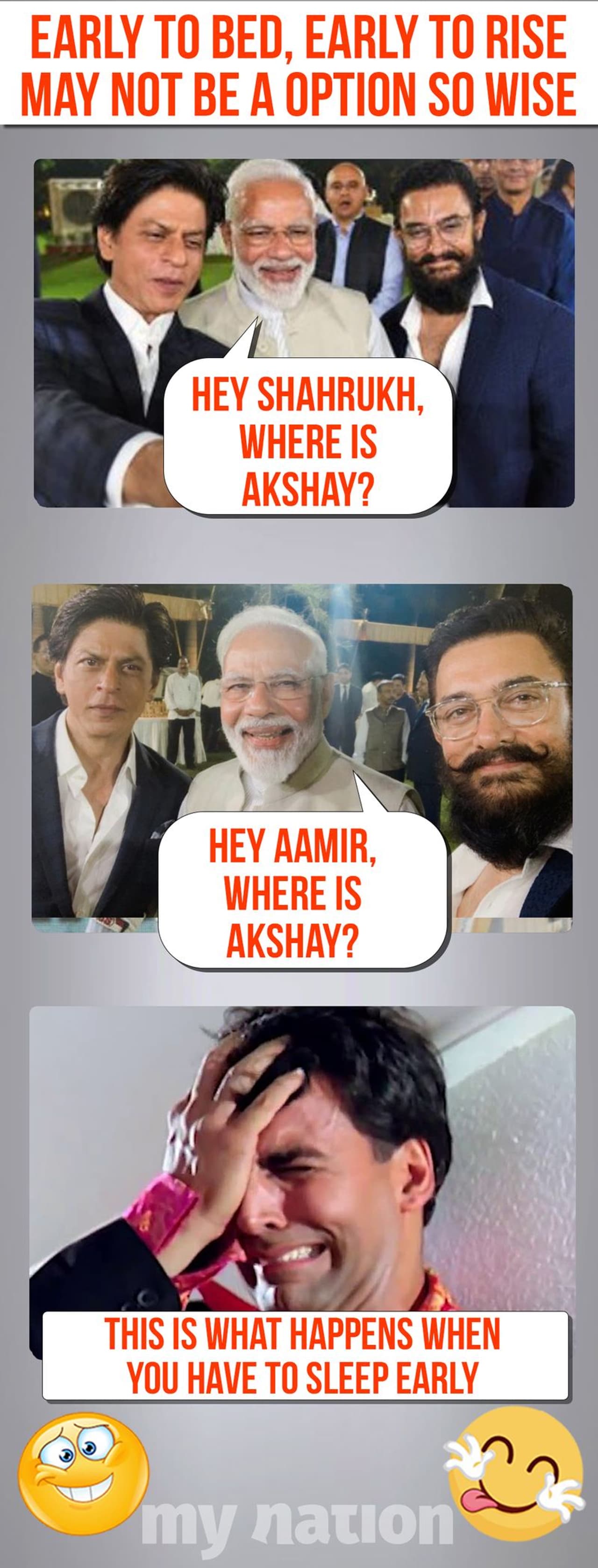 While searching for reasons, Just for Laughs of MyNation chanced upon one possibility that could be the cause of Akshay Kumar missing out. Akshay Kumar is known to be an early bird. The actor has previously admitted that his day starts as early as 5.30am and ends early too, with dinner by 7.30 pm, and sleep by 9pm.