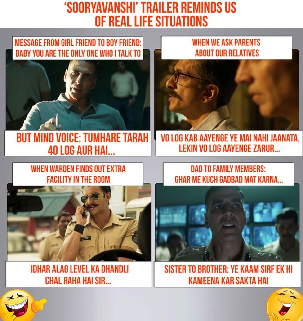 The trailer of Sooryavanshi starring Akshay Kumar, Ranveer Singh and Ajay Devgn released on March 2. Here is a small effort by the Just for Laughs team on MyNation to entertain you with a meme derived from the movie dialogues.