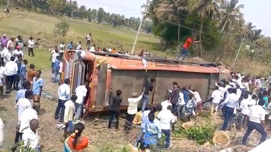 The accident happened in Gejjalagere, Maddur district, Karnataka, when the bus driver tried to avoid a collision with a parked tractor on a narrow stretch of the road. The Maddur Police, with the help of villagers, managed to get the injured passengers out from the bus.