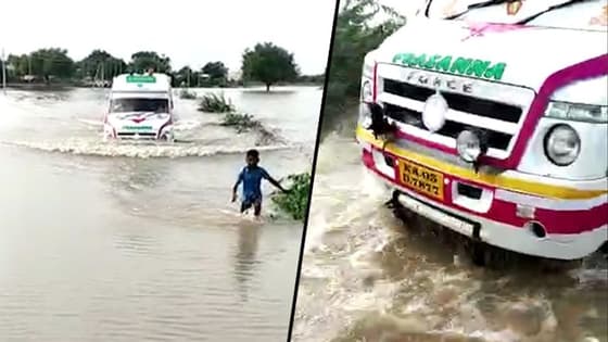 Raichuru: Venkatesh, a 12-year-old boy from Karnataka's Raichuru district, was seen guiding an ambulance that was travelling on a flooded road.