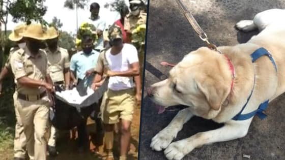 Kodagu: Kodagu’s crime buster dog Rambo died of a heart disease at the age of seven on October 7. Police department paid their last respects and carried out a guard of honour by firing three rounds in the air as a mark of respect for the canine cop. Trainers of the canine cop got emotional and teary eyed while paying their last respects to Rambo. Rambo’s trainers and police staff Sukumar and Jitendra Rai looked after the Labrador like their own child for seven long years. It is reported that the late canine cop would have turned 7 years old on October 15.