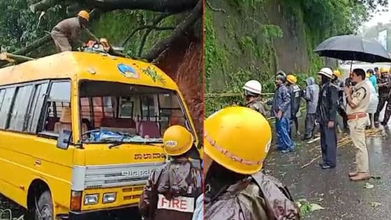 Tree branch fell on a private school bus that was carrying 17 children near Nanthoor Circle in Karnataka’s Mangaluru. No injuries were reported to the children who were inside the bus