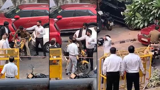 In a video, a lawyer is seen thrashing a police personnel, who is seen seated on a motorcycle outside Saket court in New Delhi