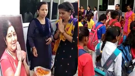 Students of Rewari Public School in Haryana observed a moment of silence and paid floral tributes in front of a portrait of Sushma Swaraj. The senior BJP leader passed away after suffering a cardiac arrest on August 6.