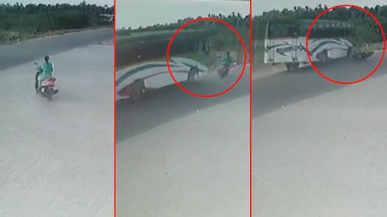 Ramanathapuram: A video of a woman on a two-wheeler run over by a private bus near Ramanathapuram in Tamil Nadu is going viral. A woman rode her two-wheeler to a main road from a petrol bunk, when a speeding bus came from behind and hit her. She fell on the right side and bus run over her before stopping. There were 32 passengers in the bus and were saved unhurt. Thevipattinam police are investigating the case.