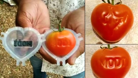 The tomato farmers were seen putting a plastic mould to the tomatoes, imprinting India map on one side and Prime Minister Narendra Modi's name on the other side