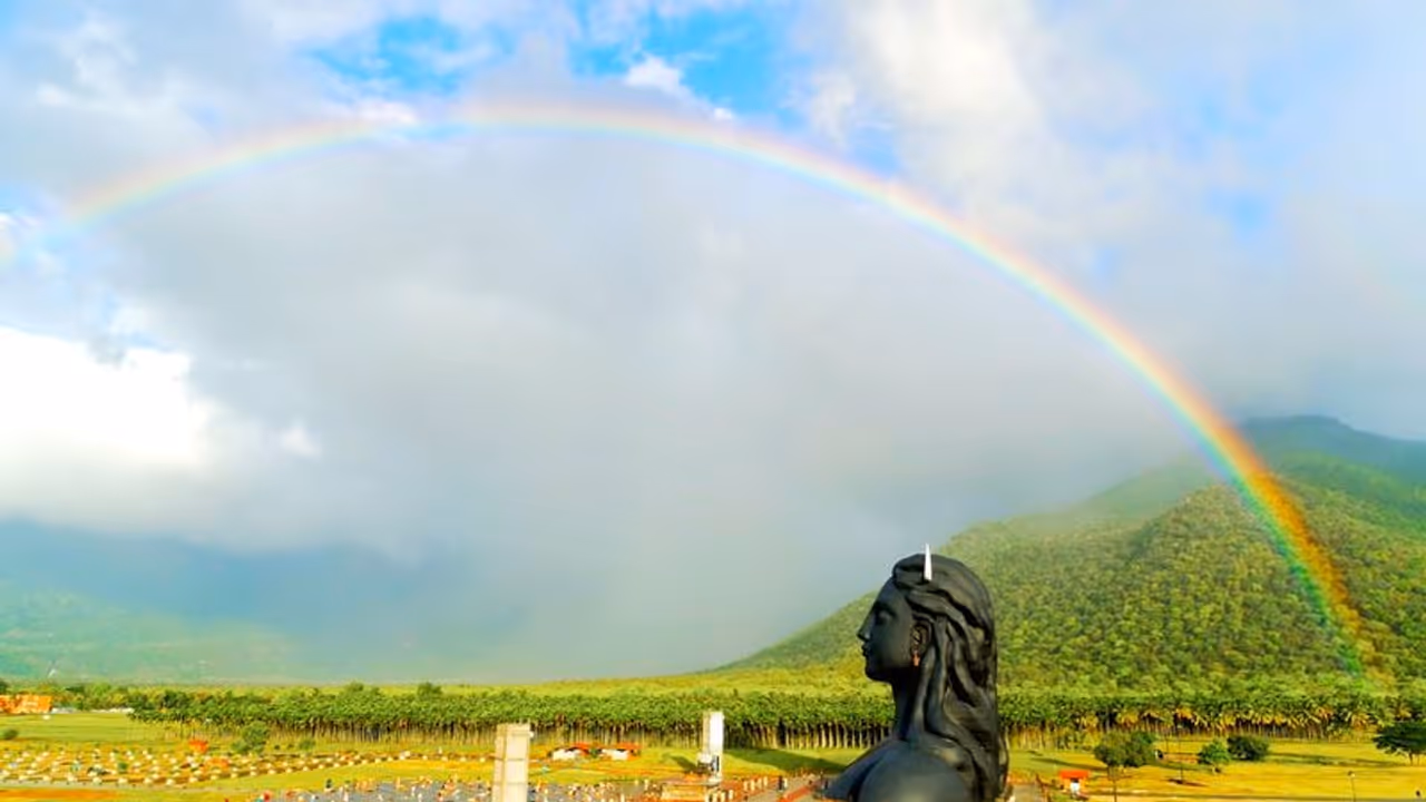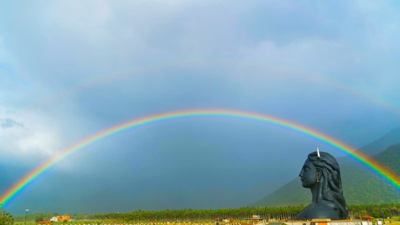 With a global pandemic looming over the world, a sense of gloom has dawned upon us. All the activities have taken a hit, economies are shrinking and there is a psychological blow that humans are enduring in these times of crisis. But as humans are under a lockdown, the nature is shining in its full glory. Here are some of the spectacular pictures from the Isha Yoga Center in Tamil Nadu where a stunning rainbow shined around the iconic face of “Adiyogi” who is the Source of Yoga.