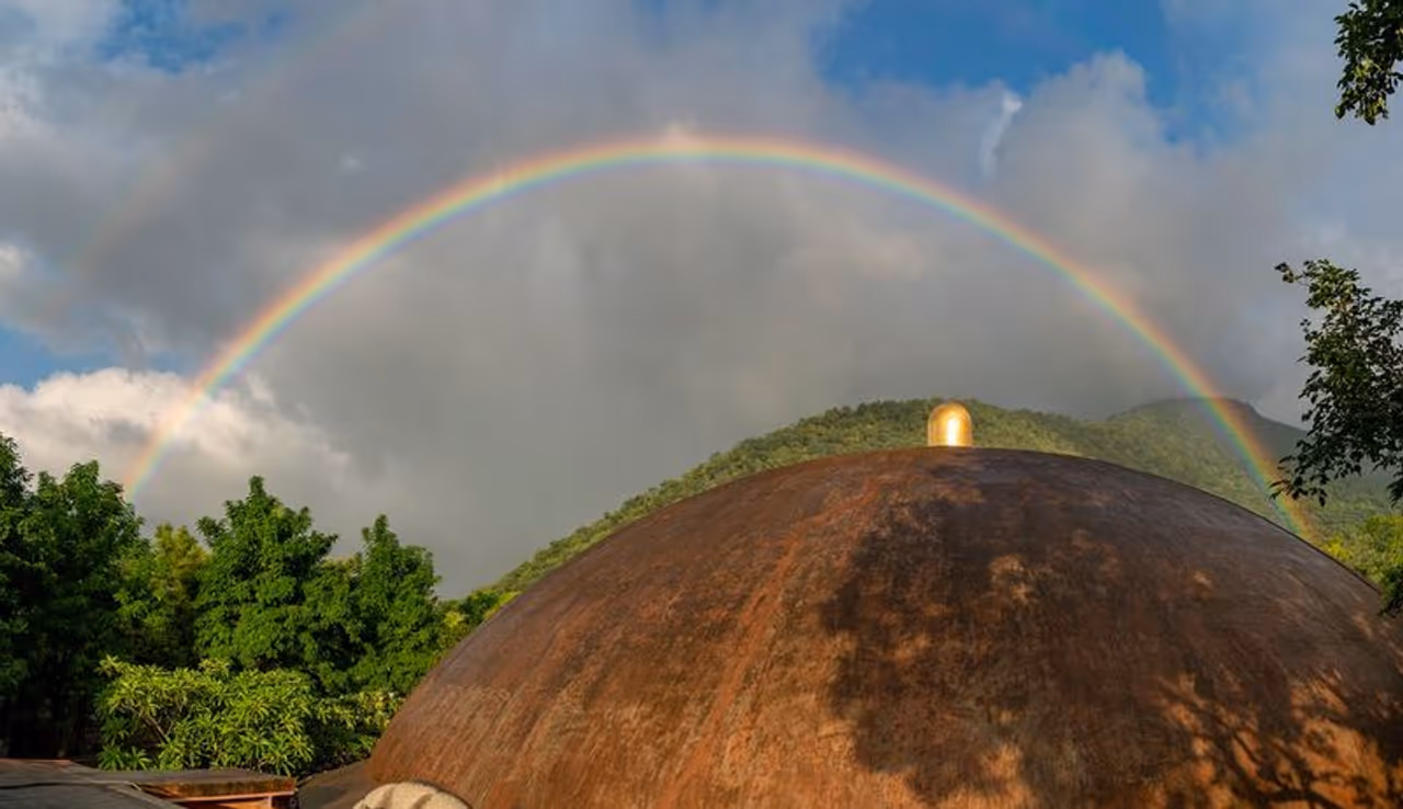 In this picture, the spectacular 7-coloured double rainbow is seen in the background of Dhayanalinga, which is a profound meditative space that does not ascribe to any particular belief or faith, and requires no ritual, prayer or worship.