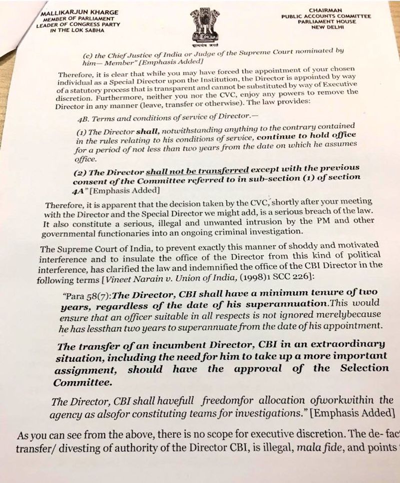 In January 2017, Congress's Mallikarjun Kharge gave a three-page dissent note objecting to Verma's appointment in the parliamentary committee comprising the Prime Minister, the Chief Minister and the Leader of the Opposition that must approve of the appointment of a CBI director. Then sceptical of Verma, Kharge noted, "It is incumbent on this committee that the candidate who outranks other candidates on the parameters of experience in the field of anti-corruption and integrity must be accorded highest preference."