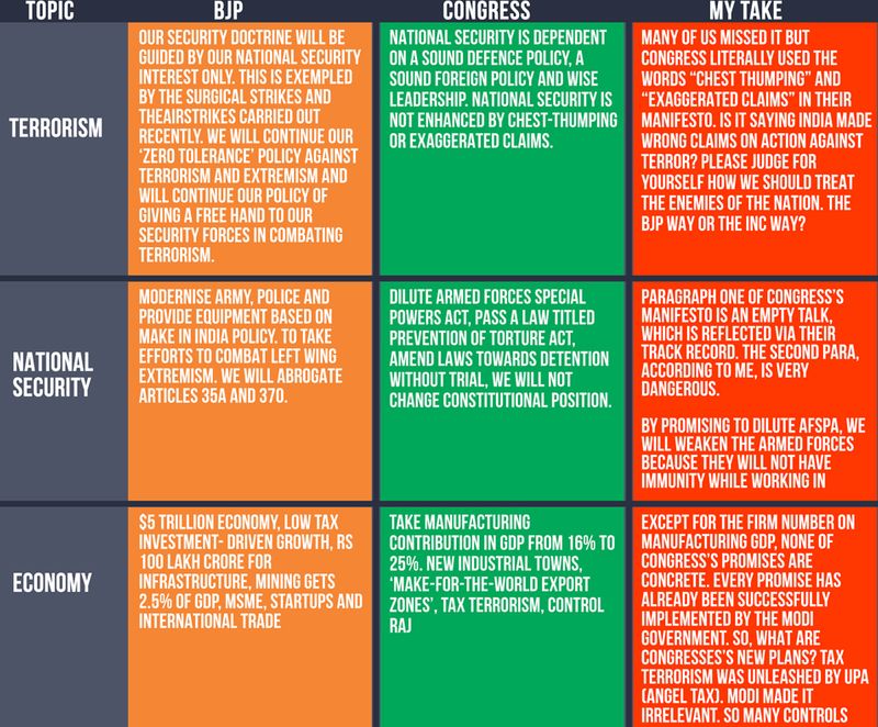 The BJP has released its ‘Sankalp Patra’or manifesto for 2019 general elections. It has called it “sankalp” because it is determined to achieve all this for the country. Meanwhile, the Congress released its manifesto a few days ago. Here I attempt to quickly break it down for you and compare promises vs sankalp.