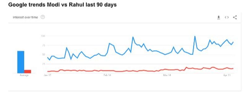 In a presidential-style contest, Rahul is no match for Modi. Even the Google trends of the past 90 days show that Modi enjoys a significant lead over Rahul in the keyword search
