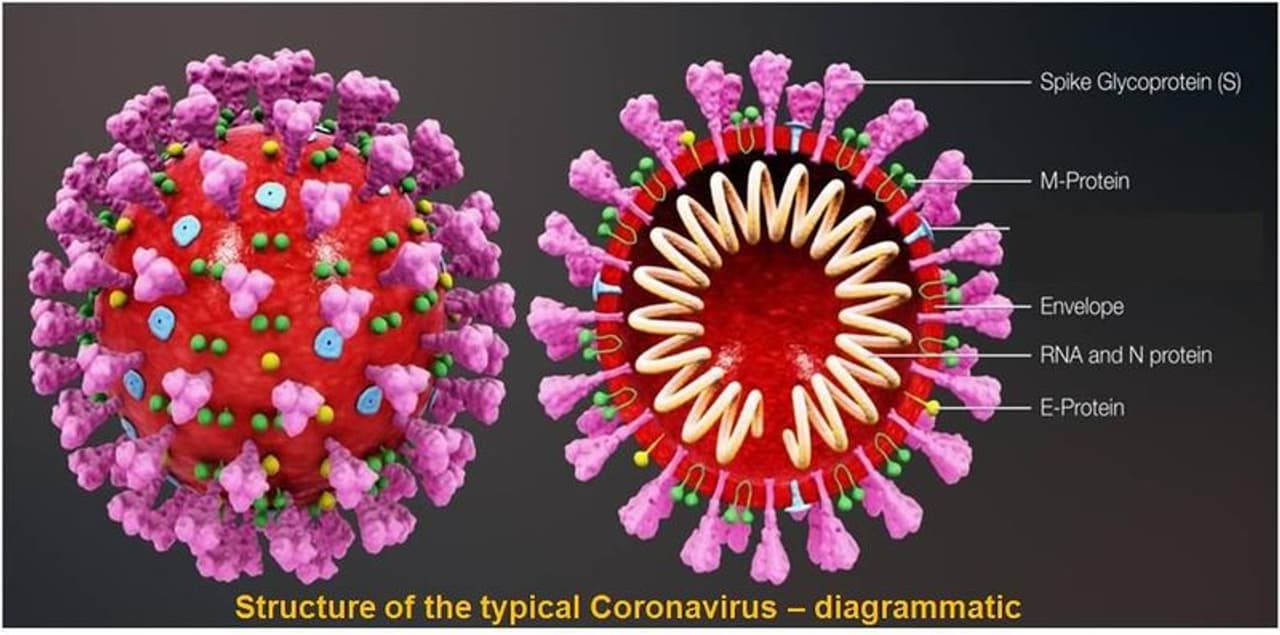 4. Structure of the coronavirus: This coronavirus is a spherical, single-stranded RNA (genetic material) virus with a protein coat. It has corona-like extensions called spike proteins on its surface. Hence the name coronavirus. The spike proteins bind to the receptors on the host cell. It is called novel coronavirus (nCoV) because of these spike proteins, which are different from those of other coronaviruses.