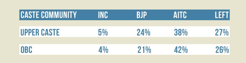 The TMC, at the end of the day, is a splinter group of the Congress and they too share complementary vote blocks, mostly from the minority sections. The minority votes were split in the 2014 general elections between Mamata, Left and Congress. Both TMC and Congress were in discussion for a seat-sharing arrangement. However, talks have failed. If they would have contested together in 2014, the Left Front candidates would have lost from the 2 seats they won. The BJP, however, would have still managed to retain their seats. The Congress has a strong presence in central Bengal which has seven seats on offer. The party won all four seats from this region in 2014. It also enjoys decent support among the non-literate and the agricultural workers in the state. An alliance with the Congress would have provided Mamata some cushion.