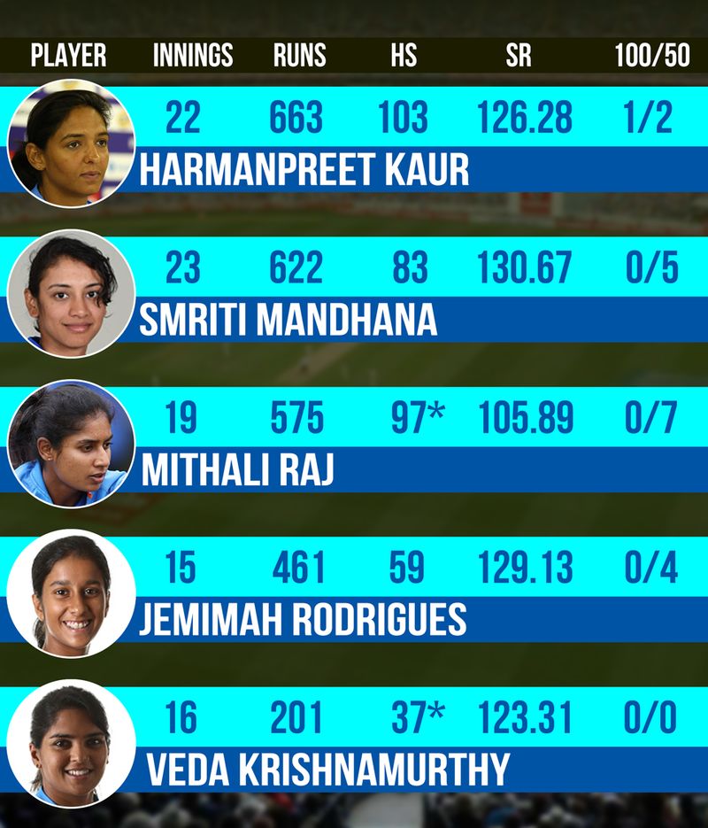 The other side that has not been revealed is that the former captain Mithali, with 575 runs and a strike-rate of 105.89, is lowest among six Indians who have more than 200 runs in this period, even though she is not too far behind her teammates Harmanpreet (663) and Mandhana (622) in the T20I charts since the new rules have come into place in October 2017.