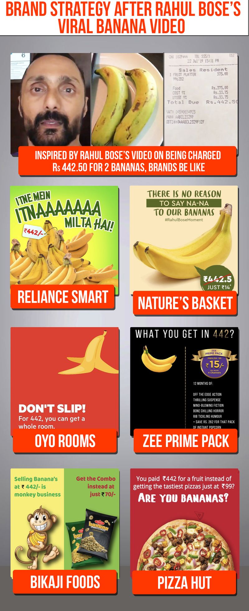 From Reliance to Nature’s Basket to Pizza Hut, every brand exposed the vanity of paying such a huge sum for a mere two bananas and gave out a list of how what all could be offered for the same price, with the help of word play and graphics!
