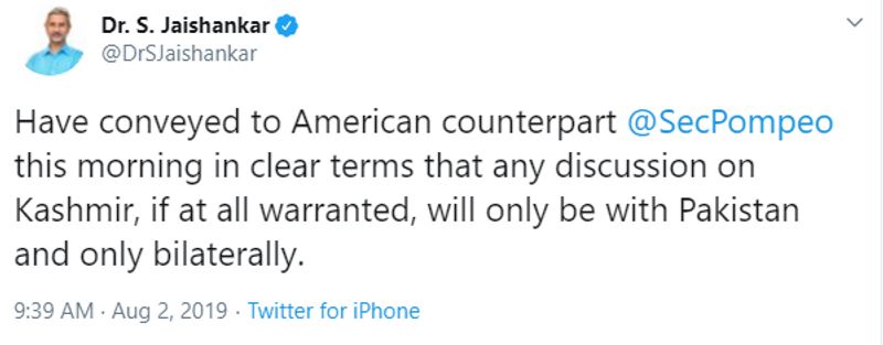 External affairs minister S Jaishankar in a tweet has made it very clear that the Kashmir issue remains a bilateral issue and that India doesn’t require US President Donald Trump’s intervention.