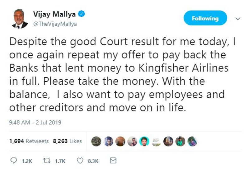 Reacting to the court order, Mallya tweeted that he wants to pay back all the dues to the bank. "Despite the good court result for me today, I once again repeat my offer to pay back the banks that lent money to Kingfisher Airlines in full. Please take the money. With the balance, I also want to pay employees and other creditors and move on in life," he said.